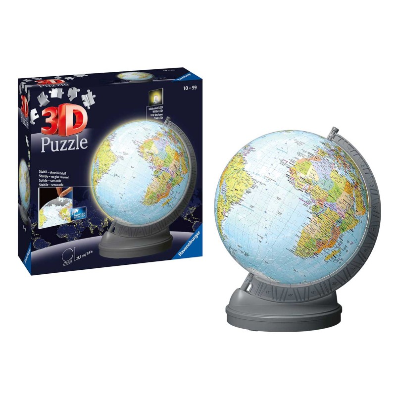 Un must have per i giramondo di tutte le età il puzzle 3d luminoso di ravensburger diffonderà lo spirito d avventura in tutta la casa potrete navigare intorno al mondo utilizzando i segni di latitudine sul semimeridiano Il mappamondo luminoso oltre a paesi e i continenti mostra la mappa politica come ulteriore elemento educativo Grazie alla tecnologia easyclick i 540 pezzi curvi del puzzle si incastrano perfettamente senza necessità della colla Gli accessori complementari includono una pratica base rotante che permette di vedere il nostro mappamondo luminoso a 360