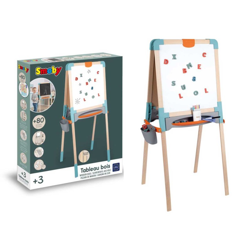 Lavagna in legno con doppia facciata 1 lato bianco magnetico per scrivere con i pennarelli lavabili e 1 lato nero per colorare con i gessetti Facilmente richiudibile Include 80 accessori 72 letter