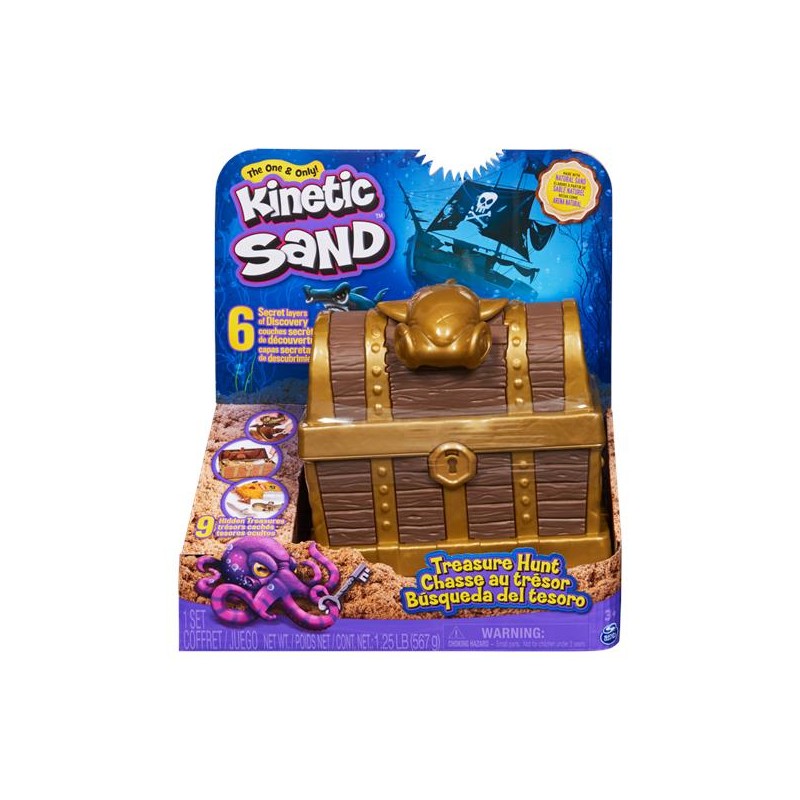 Parti per un’avventura epica con la Caccia al tesoro di Kinetic Sand. Questo emozionante set Kinetic Sand contiene sei strati di scoperte segrete e nove tesori nascosti da scoprire. Trova la chiave per sbloccare il forziere del tesoro, quindi solleva il coperchio per rivelare 454 g di Kinetic Sand marrone e una paletta sotto il coperchio. Scava nella sabbia per scoprire altri tre attrezzi a sorpresa: una spada da pirata per tagliare la sabbia, uno stampo con polpo per trasformare la sabbia e un rullo che imprime messaggi segreti. Ottieni un indizio per la tua prossima scoperta dando un’occhiata al messaggio che compare nella sabbia dorata. Il rullo sblocca il pannello sul fondo del forziere, dove troverai circa 113 g di rara Kinetic Sand dorata scintillante in una formina nascosta a forma di squalo .