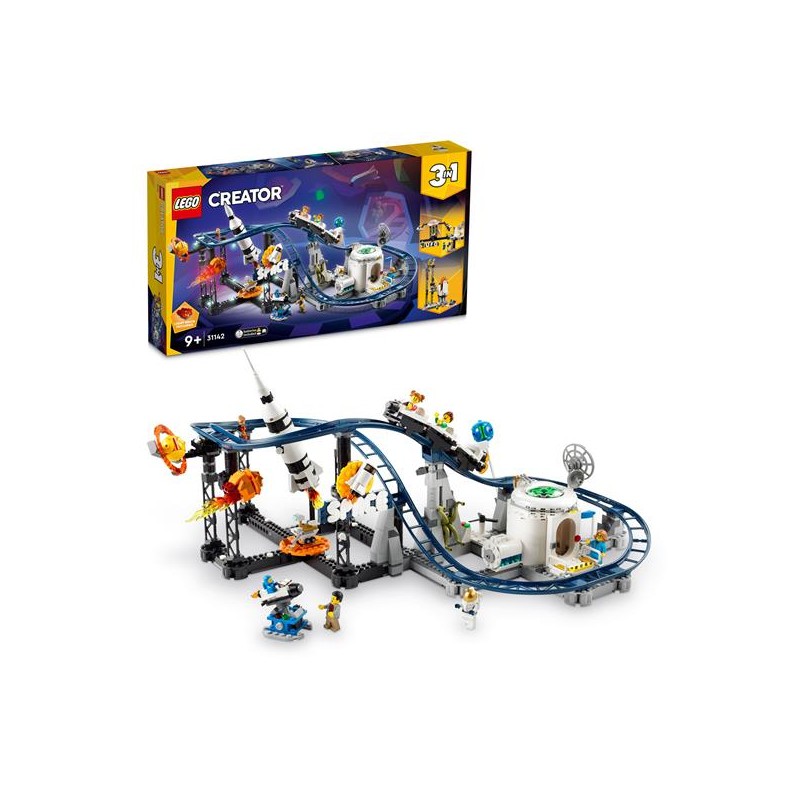 Gli appassionati di spazio dai 9 anni in su potranno divertirsi un mondo al parco dei divertimenti con il dettagliatissimo set Montagne Russe spaziali LEGO Creator 3 in 1 31142 Il playset include le montagne russe con 3 vetture mobili che sfrecciano sui binari passando accanto a un razzo spaziale decorativo a modelli di Saturno e della Terra a una base lunare e a una stella cadente C è anche una fantastica meteora con un mattoncino luminoso che può essere illuminato oltre a 5 minifigure