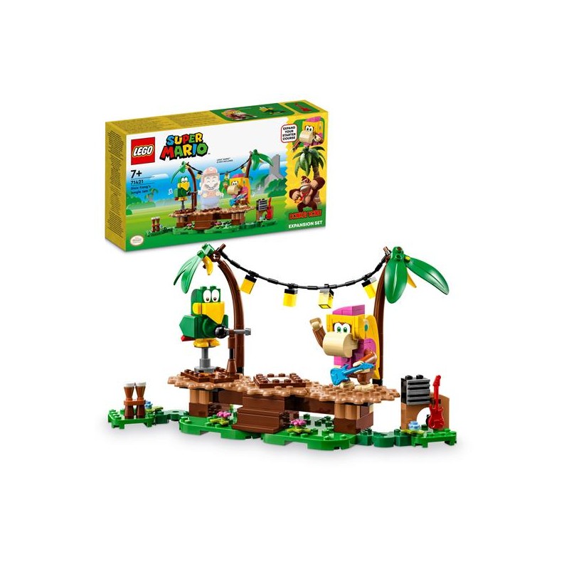 Con il Pack di espansione Concerto nella giungla di Dixie Kong LEGO Super Mario 71421 i bambini possono avventurarsi nella casa nella giungla di Donkey Kong per divertirsi con la musica il Pack contiene Dixie Kong e Pagal il pappagallo un palco costruibile scena della giungla e strumenti e attrezzature musicali Posiziona LEGO Mario LEGO Luigi o LEGO Peach personaggi non inclusi al centro del palco e girali per far ruotare le piattaforme del palco collegate attivando suoni musicali Nota per il gioco interattivo è necessario lo Starter Pack 71360 71387 o 71403