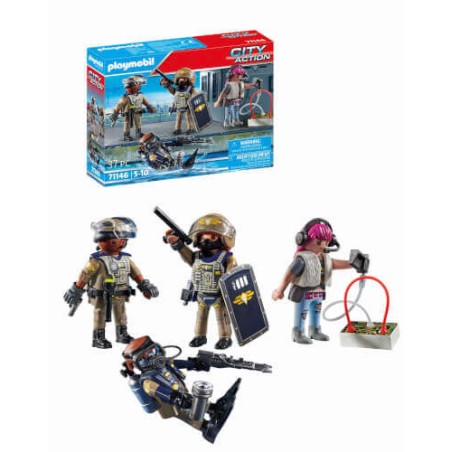 Partecipa a missioni mozzafiato la squadra dell unità speciale è pronta ogni volta che la polizia playmobil ha bisogno di un supporto extra l equipaggiamento dell unità speciale può essere agganciato alle clip della cintura dei personaggi