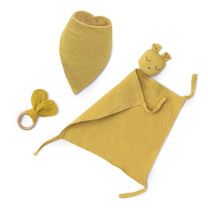 Set regalo per bebè composto da doudou in mussola bavaglino bandana e massaggiagengive