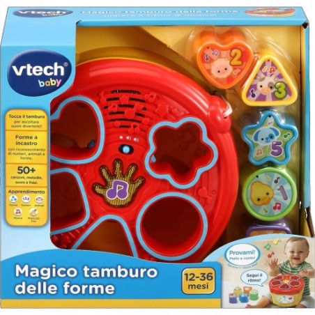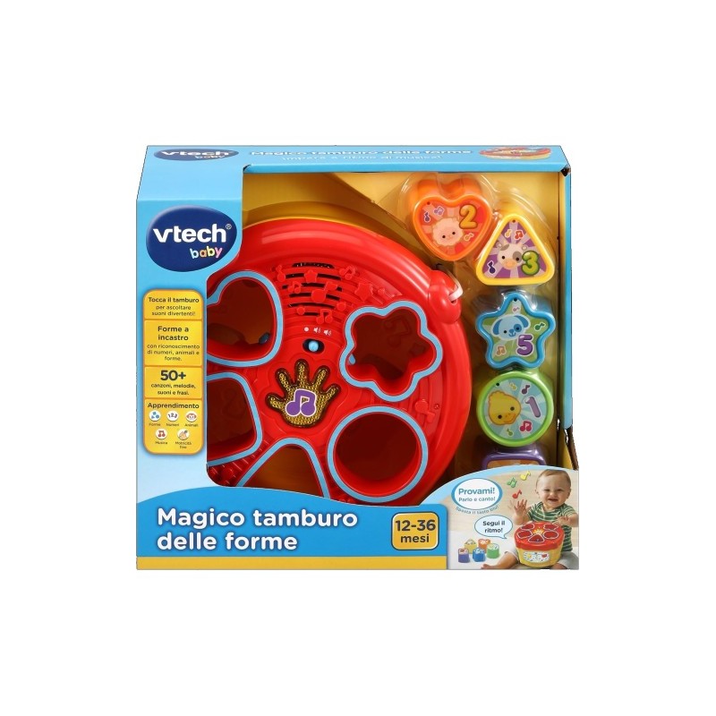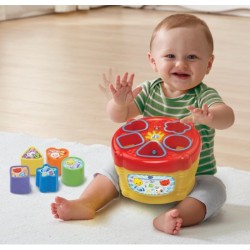 Il bambino batte le mani sul tamburo per attivare suoni divertenti
