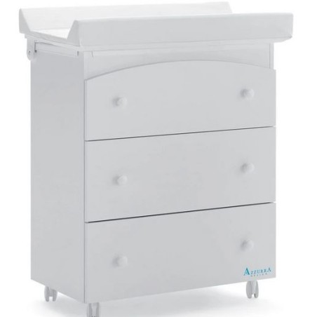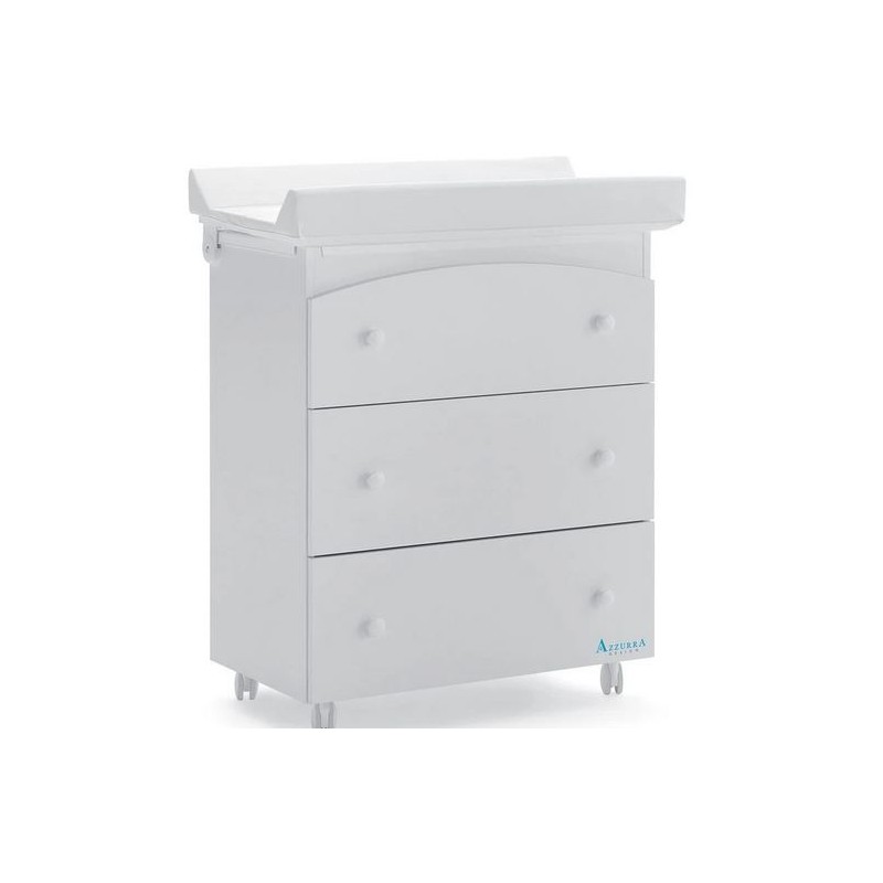 Bagnetto Fasciatoio Cassettiera Azzurra Design Tre colore bianco con 3 cassetti 3 ampi cassetti 4 ruote piroettanti di cui due con freno ripiano fasciatoio con morbido materassino pvc munito di bordi anti caduta vasca per il bagnetto ripiano fasciatoio con apertura di sicurezza per evitare chiusure accidentali durante il bagnetto del piccolo vernice atossica Dimensioni cm 76x49x89 h