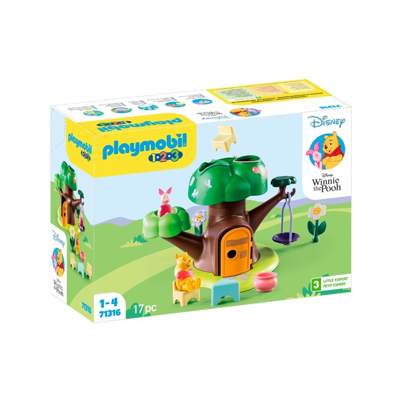 Winnie the Pooh e Piglet ti invitano nella loro grande casa sull albero Questo set della serie PLAYMOBIL 1 2 3 porta i bambini dall età di un anno nel mondo Disney con funzioni di gioco e apprendimento La casa sull albero è dotata di un altalena e di uno scivolo Winnie o maialini possono sedersi nell altalena e attraverso lo scivolo le parti che sono state smistate nelle aperture dello stampo nella parte superiore vengono nuovamente dispensate Il set allena le capacità motorie ed è anche molto divertente