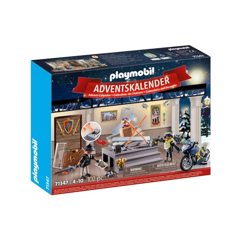 Anche durante il periodo che precede il Natale il crimine in PLAYMOBIL City non si ferma Nel furto del museo i ladri cercano di rubare reperti di alta qualità Con questo calendario dell avvento viene creato un diorama con uno scenario dettagliato di furto con scasso Il piedistallo crolla con la semplice pressione di un pulsante Tra le altre cose sono inclusi un robot di ricerca e una motocicletta della polizia