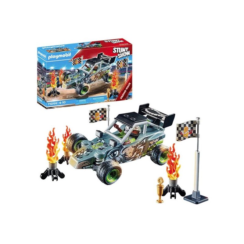 Il set in edizione limitata include un personaggio PLAYMOBIL con casco un auto le bandiere del traguardo una tanica di benzina un trofeo e altri accessori per un emozionante avventura