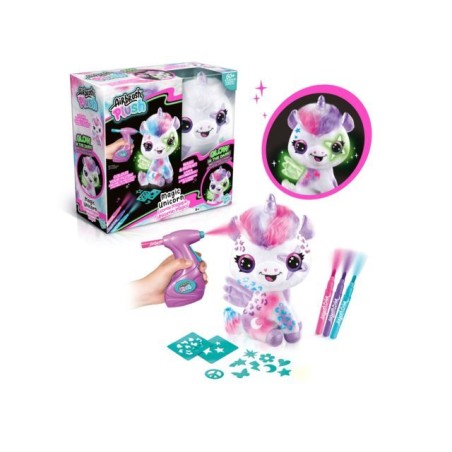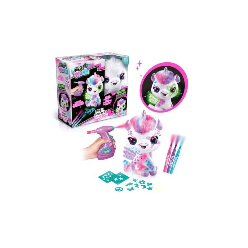 Airbrush plush magic unicorn un tenerissimo unicorno con magici inserti che si illuminano al buio all interno della confezione troverai tutto l occorrente per sbizzarrirti in decorazioni uniche e originali ottieni un effetto strepitoso con l aerografo elettrico i pennarelli colorati e gli oltre 60 stencil inclusi lava il tuo cucciolo per rimuovere il colore e ricominciare a giocare con airbrush plush la creatività non ha limiti ù