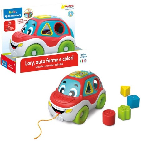 LORY AUTO FORME E COLORI una colorata auto da trainare che funge da centro attività grazie alle 4 formine da inserire e i tasti educativi per imparare le prime parole e lettere in italiano e in inglese