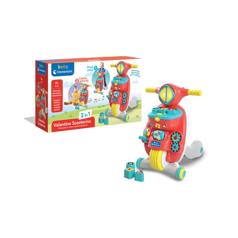 Scooter 2in1 Un originale Primi Passi ma anche un Centro Attività Meccanico ed Elettronico per imparare lettere e numeri e tanti altri contenuti educativi sviluppando coordinazione e manualità Con una struttura resistente e sicura Valentino Scooterino favorisce lo sviluppo della motricità la cooordinazione e la percezione dello spazio aiutando i più piccoli a muovere i primi passi Il pannello frontale è ricco di attività un inserimento forme interattivo un fanalino luminoso pulsante attività paginette rulli e ingranaggi Il design iconico dello scooter Baby Clementoni rivisitato in una versione moderna ed accattivante Made in Italy