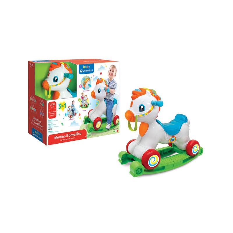 Un dolce cavallino 3 in 1 che è dondolo cavalcabile e centro attività interattivo Martino grazie ad un sensore riconosce l attività del movimento e intrattiene il bambino con effetti sonori realistici simpatiche frasi e canzoncine I tasti sulla criniera insegnano lettere versi e nomi degli animali mentre è possibile imparare i numeri grazie al rullo girevole Insegna anche lo spagnolo Ricco di canzoncine e simpatiche filastrocche Stimola la motricità lo sviluppo affettivo e del linguaggio Made in Italy