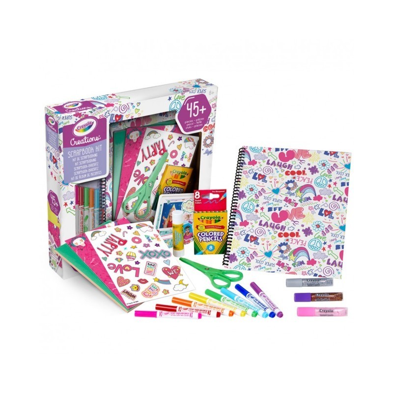 RICCO CONTENUTO PIU DI 45 PEZZI per 1 Album di scrapbook da 20 pagine 5 fogli decorativi 20 fogli colorati 2 fogli di adesivi Forbici colla 3 mini colle glitter 8 mini pennarelli lavabili 8 mini matite