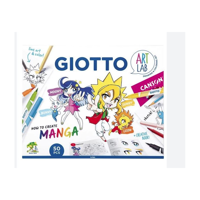 Contiene 10 pennarelli Giotto Turbo Soft Brush colori classici 6 pennarelli Giotto Turbo Color colori skin tones 1 Giotto Matita 1 pastello Giotto Stilnovo nero 1 pennarello Giotto Decor Materials bianco 30 fogli bianchi blocco A4 Canson Manga 1 guida creativa