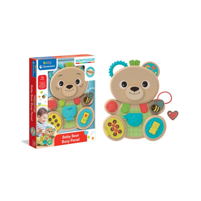 Un simpatico orsetto realizzato in plastica riciclata con elementi in legno materiali diversificati e tantissime attività tutte da esplorare Un gioco ispirato alla pedagogia Montessoriana ricco di meccanismi ed attività studiati per allenare la manualità ed esercitare la capacità di concentrazione del bambino Grazie alla presenza di materiali diversi l orsetto stimola la sensorialità guidando il bambino nell imparare a manipolare oggetti di vita quotidiana Un pannello Busy Board Montessoriano rivisitato con l inconfondibile ed empatico design Baby Clementoni Un progetto ideato in Italia e adatto a stimolare i sensi dei più piccoli