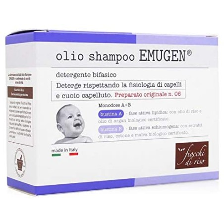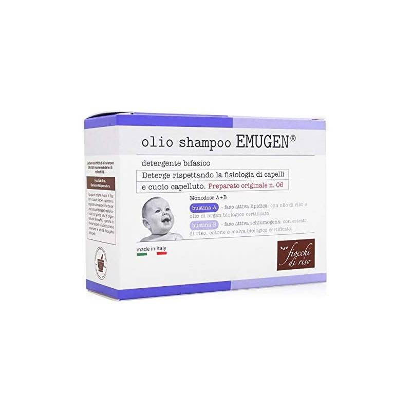 Olio shampoo Emugen Descrizione Deterge rispettando la fisiologia di capelli e cuoio capelluto Fase attiva lipidica con olio di riso e olio di argan biologico certificato Fase attiva schiumogena con