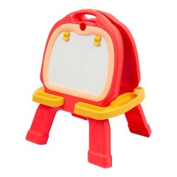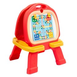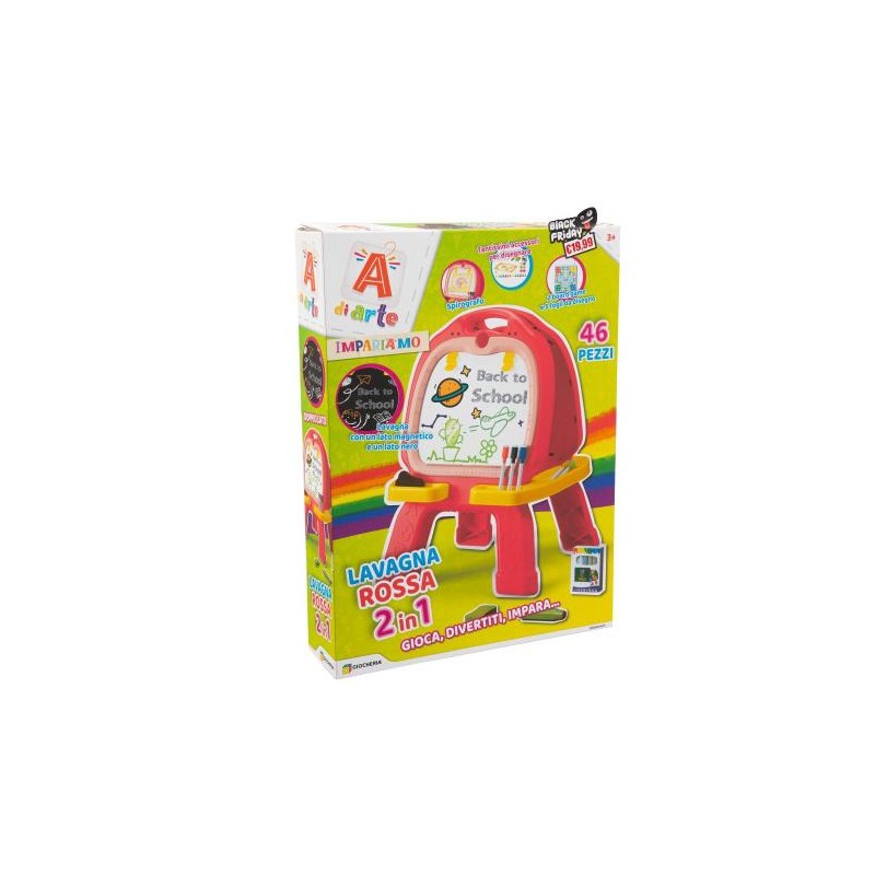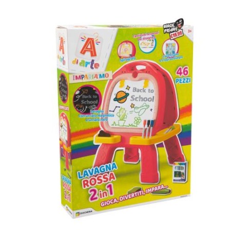 Lavagna 70 cm con due lati uno per disegnare con i gessetti e una per disegnare con i pennarelli sul lato magnetico Include 46 pezzi tra pennarelli gessetti cancellino e schede per disegnare