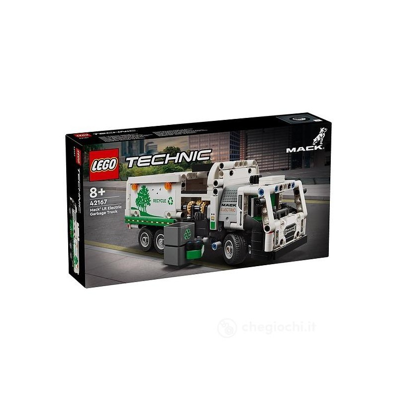 Ispira i giochi dei bambini e delle bambine da 8 anni in su appassionati di veicoli LEGO speciali aiutali a pensare all energia verde e a mantenere la città pulita con il set LEGO Technic Camion della Spazzatura Mack LR Electric 42166 Questo camion giocattolo per il riciclaggio è ispirato al modello all avanguardia di camion elettrico della spazzatura Mack e presenta movimenti e caratteristiche realistiche Dopo aver costruito il camion della spazzatura giocattolo i bambini potranno divertirsi con tanti giochi creativi mentre esplorano le funzioni del veicolo Le porte del camion Mack LEGO si aprono permettendo ai giovani di utilizzare l ingranaggio sulla parte superiore della cabina per guidare il camion Proprio come il veicolo vero questo modello di camion della spazzatura è dotato di caricatore laterale per afferrare sollevare e ribaltare i bidoni I bambini possono quindi giocare a portare via la spazzatura e a scaricarla Il set include bidoni della spazzatura ed elementi spazzatura per incoraggiare il gioco di ruolo con la fantasia I set di costruzioni LEGO Technic offrono funzioni realistiche per introdurre i giovani all ingegneria Con l app LEGO Builder inoltre i bambini possono vivere un avventura di costruzione gratificante zoomando e ruotando i modellini in 3D e monitorandone i progressi