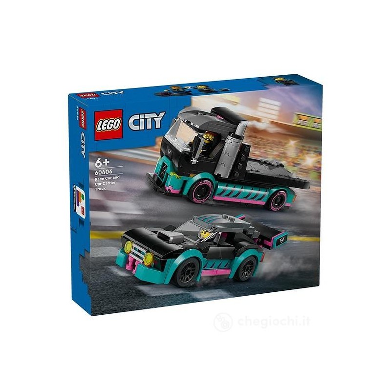 Il playset LEGO City Auto da Corsa e Trasportatore 60406 è un ottimo regalo per alimentare la passione dei motori nei bambini e nelle bambine da 6 anni in su fan delle macchine e dei camion giocattolo Questo set contiene un camion trasportatore da costruire dotato di una rampa di carico funzionante su cui far salire una macchina LEGO caratterizzata da sospensioni ribassate e grandi paraurti Il set include anche le minifigure del camionista e del pilota LEGO con il suo casco con cui dar vita a storie e avventure divertenti Questo set di costruzioni per bambini con auto da corsa giocattolo e camion LEGO include una guida alla costruzione stampata facile da seguire oltre alle istruzioni digitali comprese nell app LEGO Builder con cui i bambini possono ingrandire e ruotare i modellini in 3D per visualizzarli da tutte le angolazioni mentre li costruiscono I set di veicoli LEGO City accompagnano i bambini nel loro percorso di crescita con mezzi e macchine ricche di dettagli che consentono ai piccoli di esplorare da vicino modelli realistici e personaggi divertenti che ispirano il gioco di fantasia