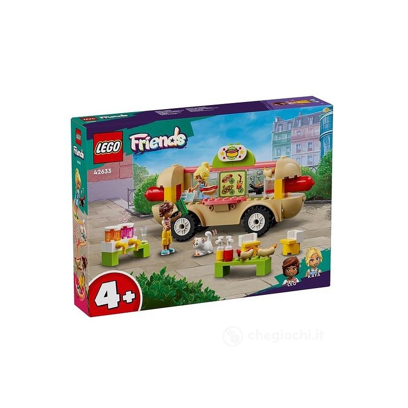 I piccoli amanti dei set con cibo finto e cucina giocattolo possono trascorrere tante ore divertenti con il playset LEGO Friends Food Truck Hot Dog 42633 un gioco per bambine e bambini da 4 anni in su ricco di accessori Questo simpatico food truck giocattolo permette ai piccoli di prendere confidenza con le costruzioni LEGO Comprende un piccolo camion giocattolo da costruire a forma di hot dog 2 mini bamboline un gatto LEGO e accessori alimentari per ispirare i giochi di ruolo Questo veicolo giocattolo è un ottima idea regalo per il compleanno dei bambini o per altre occasioni Gli chef in erba che amano i giochi educativi possono aiutare Kaya a preparare e servire gli hot dog Leo sta visitando il food truck con il suo gatto Churro e si diverte a discutere con Kaya delle diverse opzioni di cibo e bevande tra cui un hot dog vegano ketchup senape e succhi di frutta I set di giochi LEGO 4 sono progettati per offrire ai piccoli un esperienza di costruzione immediata e divertente contengono un utile Starter Brick una solida base con cui i bambini possono subito dar vita al gioco L app LEGO Builder guida genitori e bambini attraverso un avventura di costruzione intuitiva permettendo di ingrandire e ruotare i modelli in 3D salvare i set e tenere traccia dei progressi