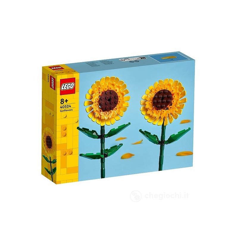 I girasoli riempiono subito di allegria e ottimismo tutto ciò che li circonda Ora puoi costruire la tua versione di questo amatissimo fiore ed usarlo come decorazione di casa o come accessorio per la camera da letto con il vivace kit di costruzione di fiori finti LEGO Creator Girasoli 40524 per bambini e bambine da 8 anni in su Questo colorato set da costruire della gamma LEGO fiori e piante consente di creare un incantevole esposizione utilizzando i 2 fiori artificiali dotati di steli e foglie verdi regolabili oppure un grande bouquet misto da inserire in un vaso aggiungendo i girasoli finti ai set Rose LEGO 40460 Tulipani LEGO 40461 o Bouquet di Fiori LEGO 10280 ciascuno venduto separatamente Questo set è un ottimo regalo per una ragazza o un ragazzo che ama i set di fiori LEGO ma anche un dono per la festa della mamma o per regalare un sorriso a una persona cara Con l app LEGO Builder si può vivere un esperienza di costruzione completa grazie agli strumenti digitali presenti con cui zoomare e ruotare i modellini in 3D tenere traccia dei progressi fatti e salvare i set durante la costruzione