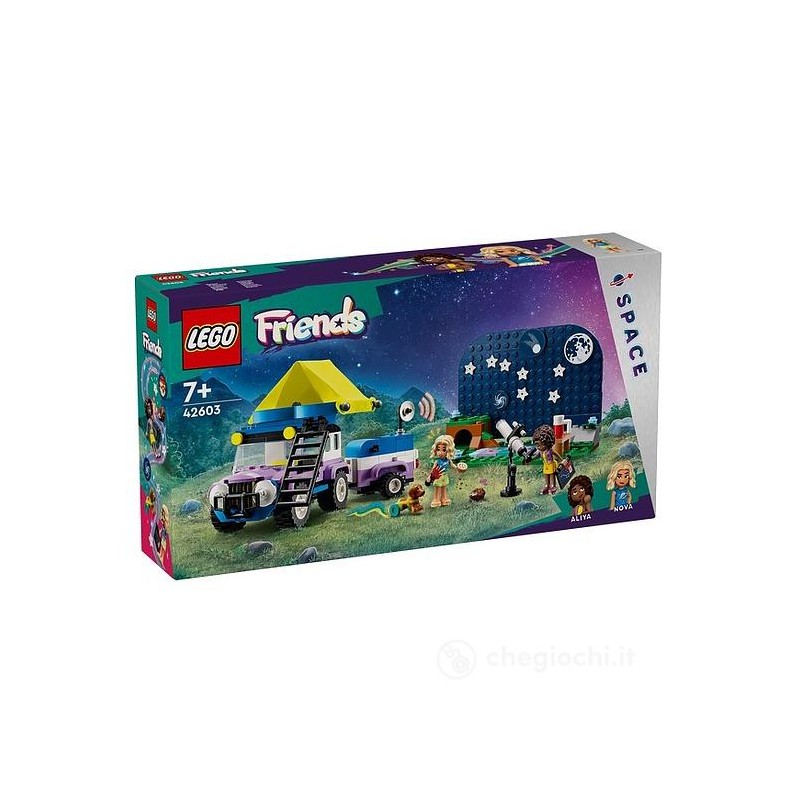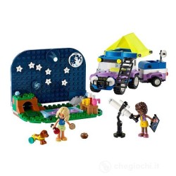 I piccoli che amano i giochi d avventura hanno tanto da scoprire con il playset LEGO Friends Camping Van Sotto le Stelle 42603 un set di giochi per bambine e bambini da 7 anni in su per tanto divertimento all aria aperta Il set include un telescopio giocattolo un modellino di auto 4x4 da costruire con roulotte e tenda pieghevole le 2 mini bamboline dei personaggi LEGO Friends di Aliya e Nova un cane giocattolo e un riccio Ispira i giochi scientifici dei bambini con questo set da campeggio e aiutali a creare le costellazioni sullo sfondo usando le tessere LEGO con i disegni dei pianeti e delle stelle Questa costruzione per bambini comprende diversi accessori con cui dar vita a storie di amicizia tra cui tazze biscotti biscottini per cani un binocolo un telescopio una torcia elettrica un tablet stelle aggiuntive e stampe di diversi pianeti per la personalizzazione Questo set di costruzioni LEGO è un divertente regalo di compleanno per i bambini che amano i giocattoli di esplorazione scientifica I giovani possono sperimentare un modo facile di costruire tramite l intuitiva app LEGO Builder che offre strumenti per ingrandire e ruotare i modelli in 3D per salvare i set e per monitorare i progressi fatti