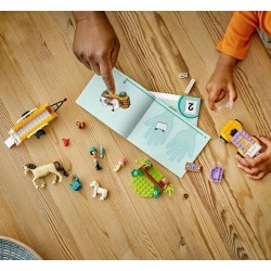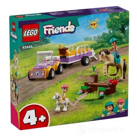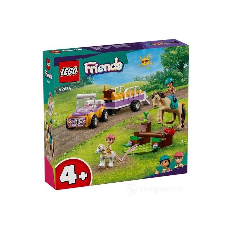 Da il via a ore di giochi creativi e a tante avventure con il playset LEGO Friends Rimorchio con Cavallo e Pony 42634 un divertente gioco per bambine e bambini da 4 anni in su Questo kit per appassionati di cura degli animali giocattolo comprende un auto con rimorchio da costruire su cui poter trasportare il cibo del cavallo giocattolo e del pony inlcusi nel set che appartengono ai personaggi LEGO Friends di Liann e Zoya Un simpatico regalo di compleanno per bambini creativi completo di tanti accessori giocattolo per divertenti giochi di ruolo i bambini possono aiutare le mini bamboline a spazzolare gli animali e a prepararli per la galoppata Nella foresta trovano un albero caduto con cui allenare i cavalli a saltare gli ostacoli Dopo una divertente giornata in sella gli amici premiano i cavalli LEGO con una gustosissima carota Le costruzioni LEGO 4 sono progettate per donare ai piccoli un esperienza di gioco divertente mentre utilizzano i grandi blocchi per costruire Sono set dotati di un utile Starter Brick una solida base con cui i bambini possono iniziare a mettere facilmente in scena le loro avventure Con l app LEGO Builder genitori e bambini sono guidati in un esperienza di costruzione intuitiva con strumenti per ingrandire e ruotare i modelli in 3D salvare i set e tenere traccia dei progressi fatti