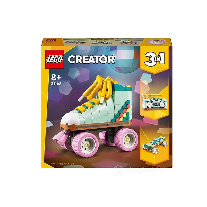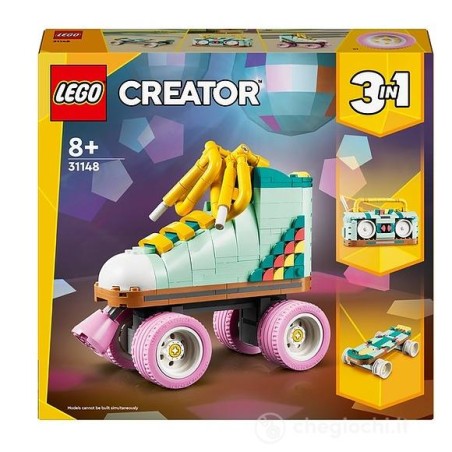 Con il set di giochi LEGO Creator 3 in 1 Pattino a Rotelle Retrò 31148 per bambini e bambine da 8 anni in su gli amanti degli accessori vintage da usare come decorazione di casa o della camera da letto potranno fare un colorato viaggio indietro nel tempo Il set contiene un pattino a rotelle per bambina e bambino da costruire dotato di 4 ruote mobili di colore rosa freno spessi lacci gialli e tanti pezzi colorati con cui decorare la parte posteriore dello stivale così da consentire ai piccoli di realizzare il proprio design Questo set di giochi retrò LEGO Creator 3 in 1 offre 3 diverse esperienze di costruzione e gioco con gli stessi mattoncini I piccoli possono costruire il pattino a rotelle giocattolo ricostruirlo in un colorato mini skateboard retrò con 4 ruote mobili o in una radio boom box giocattolo dotata di una piccola antenna Tutti e 3 i modellini da costruire sono oggetti affascinanti che i bambini possono esporre su uno scaffale al termine delle loro avventure di gioco Questo set di giochi LEGO Creator 3 in 1 è un ottima idea regalo per una ragazza o un ragazzo appassionati di oggetti e gadget vintage I giovani saranno entusiasti di ricevere questo set da costruire e ricostruire con cui passare tante ore divertenti La gamma LEGO Creator offre modellini veicoli e strutture che soddisfano le passioni di tutti i fan delle costruzioni LEGO