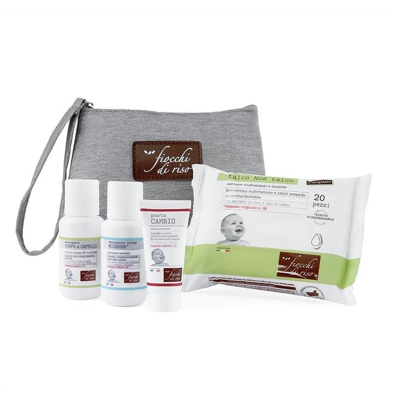 Un praticissimo kit da viaggio per la cura della pelle del bambino completo di stilosa pochette ideale anche come idea regalo con la consueta qualità del marchio Fiocchi di Riso
