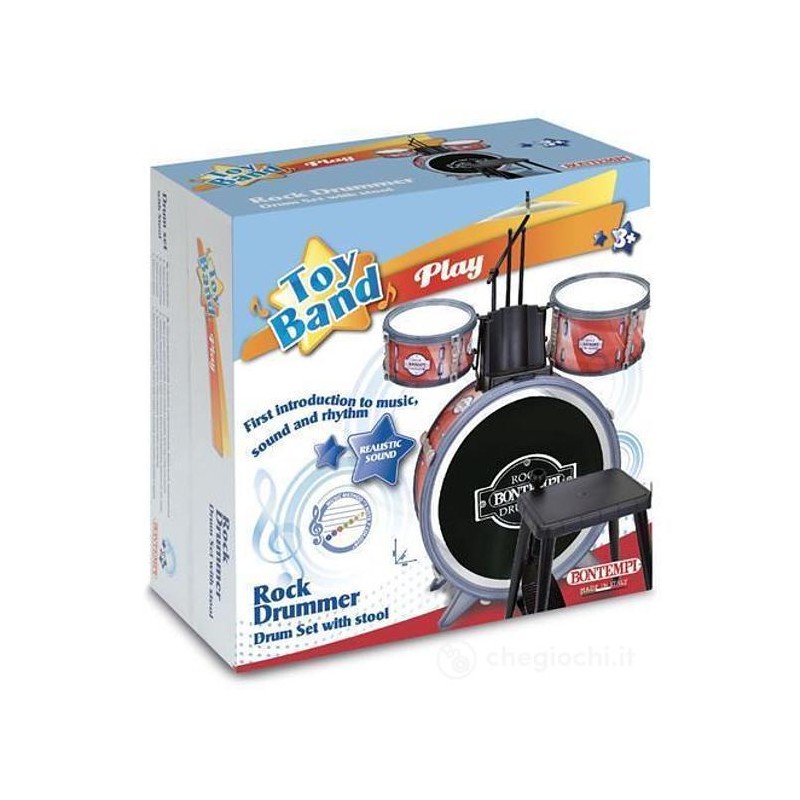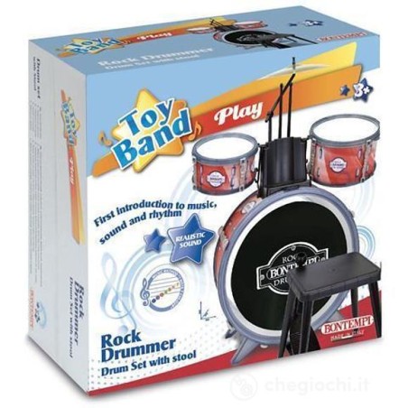 Batteria grancassa Ø 385 mm con pedale 2 tamburi Ø 170 e 210 mm Piatto metallico Ø 210 mm 2 bacchette Suoni realistici Corredata di sgabello Dim 500x500x680 mm