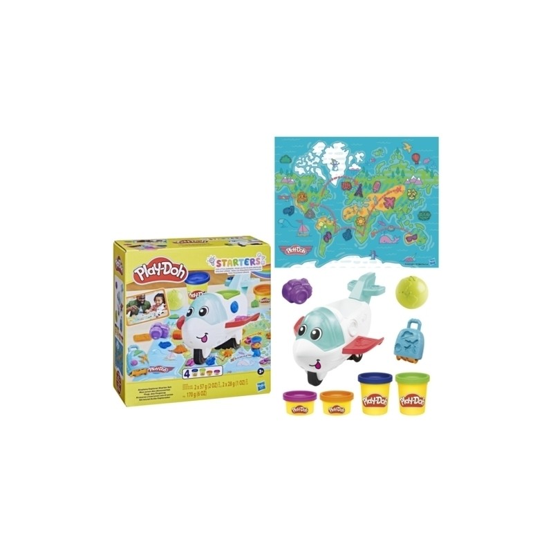 Benvenuti a bordo dello starter set Aereo esploratore di Play Doh Questo aereo giocattolo per bambini e bambine permette di giocare in diversi modi con la pasta modellabile Play Doh e immaginare di vivere avventure in giro per il mondo senza bisogno del passaporto I piccoli curiosi possono creare e abbinare oggetti al tappetino da gioco creare piloti e passeggeri per guidare l aereo giocattolo e molto altro ancora grazie ai 3 accessori Play Doh e alla pasta modellabile in 4 colori diversi I giocattoli di fantasia come questo set Play Doh aiutano i bambini a sviluppare un interesse verso la comunità e il mondo che li circonda mentre esercitano le loro abilità fino motorie e sviluppano la loro creatività Dove li condurrà la loro immaginazione Hasbro Play Doh e tutte le proprietà correlate sono marchi commerciali di Hasbro