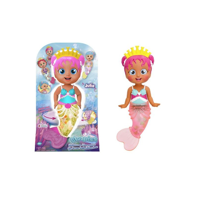 Dal fondo del mare arrivano le nuove e bellissime Bloopies Shimmer Mermaids dolci sirenette per un bagnetto super divertente Julia ha la coda trasparente piena di ciondoli luccicanti che si muovono quando la riempi di acqua Ha il corpo morbido e quando la strizzi delicatamente spruzza acqua dalla bocca e fa bolle Ci sono 4 diverse sirenette Shimmer Mermaids da collezionare tutte bellissime e vendute separatamente