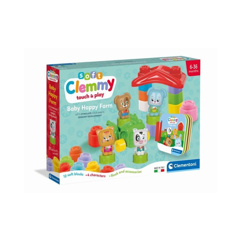Tanti mattoncini colorati un trattore e un trattore per rivivere le avventure illustrate nel pratico libro della Clemmy baby happy farm I mattoncini Clemmy lavabili e atossici sono pensati per far giocare i più piccoli in assoluta sicurezza Tanti colori vivaci che stimolano la percezione visiva l attenzione e la capacità di osservazione