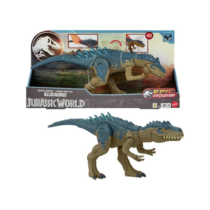 Attacco furioso Questo personaggio attacca con un movimento realistico continuo la rotella attiva un feroce attacco verso l alto con il collo seguito da morsi e ruggiti spaventosi Pronto per la battaglia Questo dinosauro Allosauro presenta degli aculei sulla schiena e sulla coda che diventano sempre più lunghi e feroci quando si attiva il pulsante Questo dinosauro giocattolo è pronto ad affrontare qualsiasi rivale Ruba la scena Con una lunghezza di circa 43 cm questo dinosauro snodato è pronto per giocare in modo feroce o per un esposizione spaventosa grazie alle fauci che si aprono e si chiudono ai denti affilati e all aspetto complessivamente minaccioso Presenta una texture dettagliata e una decorazione dell habitat fluviale Connetti e gioca Scansiona il codice di tracciamento nascosto nell app gratuita Jurassic World Play con un dispositivo smart compatibile non incluso per le attività e i divertentissimi giochi in Realtà Aumentata Giochi di corse e altro ancora Il motocross si trasforma in una distruzione selvaggia quando il pilota e la moto si trasformano in un dinosauro furioso che travolge gli ostacoli e semina il caos Un tocco speciale E' un ottimo regalo per i fan dei dinosauri dai 4 anni in su e un ottima aggiunta a qualsiasi collezione Jurassic World