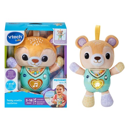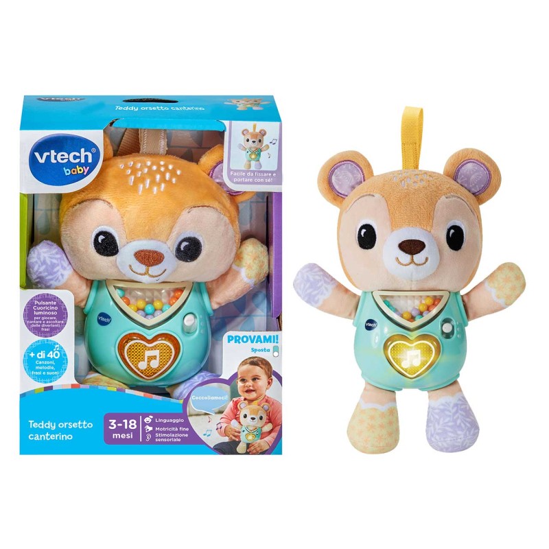 Teddy Orsetto canterino con un cuoricino luminoso per ascoltare divertenti frasi simpatiche canzoni e dolci melodie Perline colorate nel pancino dell orsetto da scuotere per sentire il suono di un sonaglino Realizzato con materiali differenti per stimolare tutti i sensi del tuo bambino Facile da portare ovunque grazie alla cinghia in tessuto con fascetta autobloccante Più di 40 canzoni melodie frasi e suoni Regolazione del volume e spegnimento automatico 3 canzoni e 15 melodie Scatola Try Me