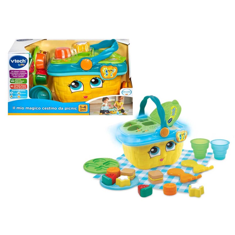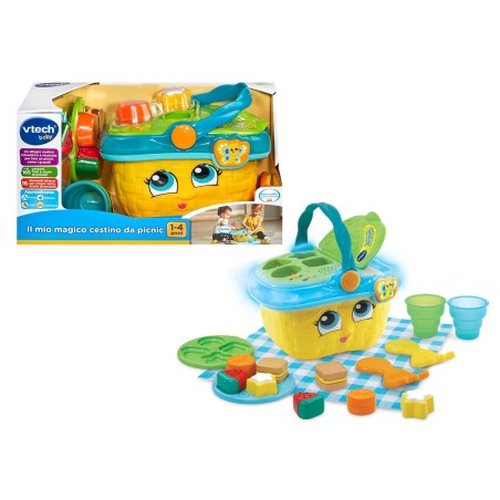 Il mio magico cestino con 16 accessori diversi per creare tante storie divertenti 1 cestino 1 tovaglia 2 forchette 2 bicchieri 2 fette di arancia 2 fette di anguria 2 sandwich 2 dolcetti e 2 piatti sagomati 3 modalità di gioco per imparare le forme i colori gli alimenti e la condivisione divertendosi Forme ad incastro il cestino riconosce le forme e gli alimenti inseriti al suo interno Pulsante farfalla per ascoltare delle frasi delle domande e delle allegre canzoni Il cestino interagisce con il tuo bambino quando il coperchio viene sollevato il cestino parla canta e riproduce dei suoni divertenti Regolazione del volume e spegnimento automatico Più di 165 canzoni frasi e suoni divertenti Scatola Try Me