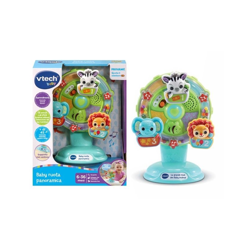 Ruota panoramica con 3 pulsanti a forma di animaletto Zoe Elio e Leo che accompagnano il tuo bambino nelle sue scoperte insegnando i numeri gli animali i colori e gli oggetti Stelle colorate che si illuminano al ritmo dei suoni e delle melodie Sensore di movimento integrato che riproduce suoni divertenti ogni volta che si fa girare la ruota Supporto con ventosa per poter attaccare facilmente e in tutta sicurezza la ruota sul seggiolone e sulle superfici lisce Più di 45 canzoni melodie frasi e suoni 4 canzoni e 10 melodie Regolazione del volume e spegnimento automatico Scatola Try Me