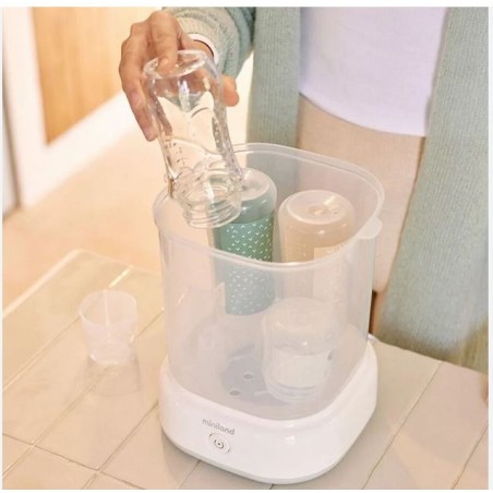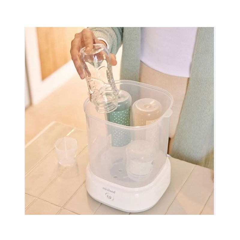 Un piccolo sterilizzatore e molto semplice da usare che si può portare con sé ovunque con capacità fino a cinque bottiglie Con mini vapore e biberon e accessori saranno completamente puliti in 8 minuti Per continuare a usarli tutte le volte che ti serve Offre la possibilità di sterilizzare anche la titolatura o i ciucci delle titolanti grazie ad una speciale griglia progettata per questo Piccolo e versatile