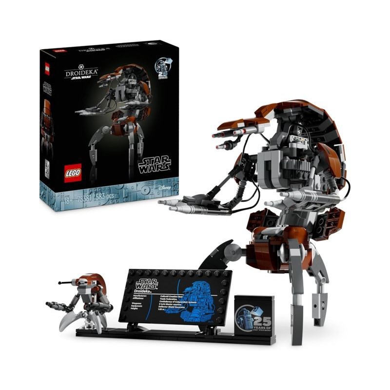 Mattoncino del 25 anniversario questo set include un supporto con spazio per il piccolo droide Droideka LEGO Star Wars una targa informativa sul Droideka e un mattoncino del 25 anniversario LEGO Star Wars
