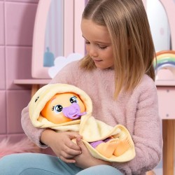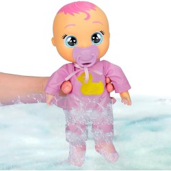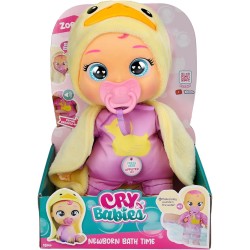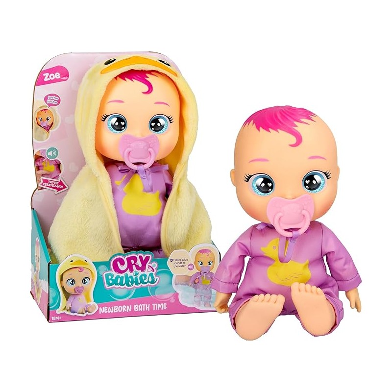 Bambola Neonata Newborn Zoe ha una tutina ed un accappatoio da paperetta personalizzati ed è pronta per il bagnetto Reagisce e riproduce suoni di bebè quando la bagni Piange lacrime vere se i bambi