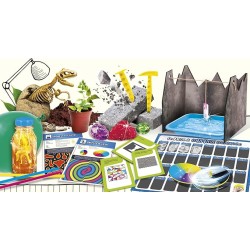 Torba pietrine guanti apriprovetta bicarbonato di sodio tiosolfato di sodio trottola vasetto uovo di dinosauro da scavare blocco di minerali da scavare attrezzi scavo palloncino cannuccia bottiglietta con tappo grotta di cartone schede e cerchi di ottica schede esperimenti poster calendario da grattare manuale illustrato