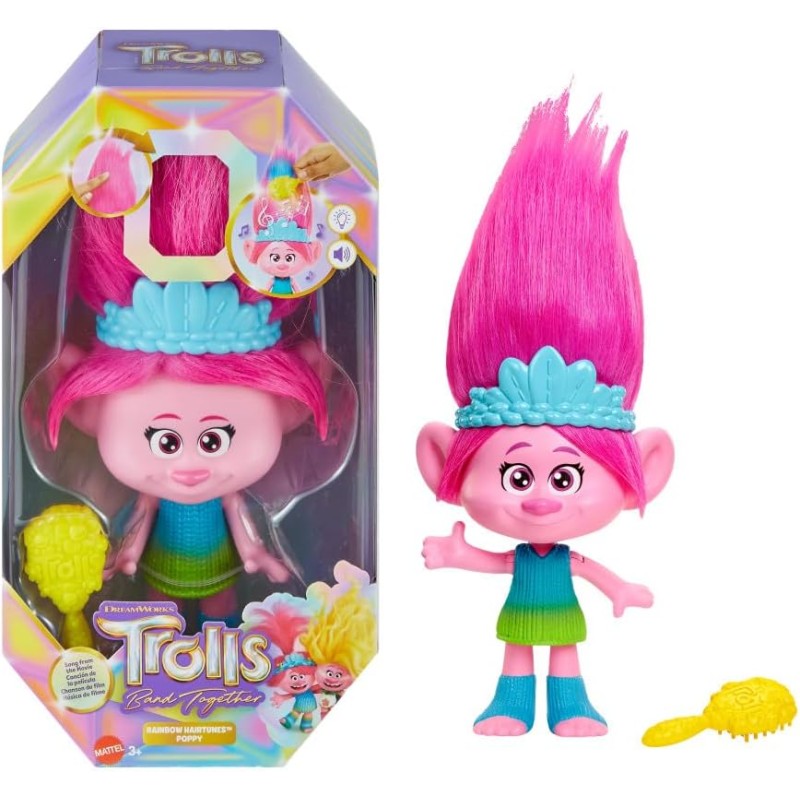 I fan possono trasformare il gioco in una festa con i loro personaggi DreamWorks Trolls preferiti Ispirate al film DreamWorks Trolls Tutti Insieme le bambole Rainbow HairTunes sfoggiano capelli musica e frasi scintillanti Passa la spazzola in dotazione tra i capelli delle bambole per dare inizio alla festa Man mano che muovi la spazzola sui capelli si attivano suoni e luci differenti Ogni bambola include un accessorio unico e rimovibile per inventare tante entusiasmanti storie Con cos tante vibrazioni positive bambini e bambine vorranno collezionare tutte le bambole e i giocattoli Trolls per ricreare le scene e scatenarsi Ognuna in vendita separatamente secondo disponibilit Le bambole non possono reggersi in piedi da sole Colori e decorazioni possono variare