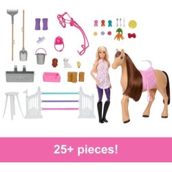 Per stimolare il gioco i bambini possono aiutare Barbie a prendersi cura del suo cavallo con squisite verdure presso la stazione di alimentazione o a pulirlo e spazzolarlo il cavallo nella zona della toeletta