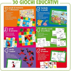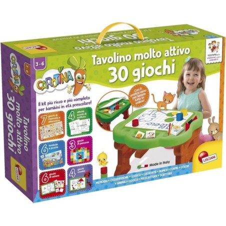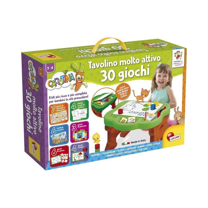 30 divertenti giochi educativi da fare sul robusto tavolino di Carotina Nella confezione è inclusa una penna scrivi e cancella per imparare a scrivere e a disegnare Il kit comprende anche una pratica guida illustrata per i genitori con la descrizione di tutti i giochi e le attività tra cui il tangram giochi di memoria e di percorso e tanti altri ancora età 3 6 anni
