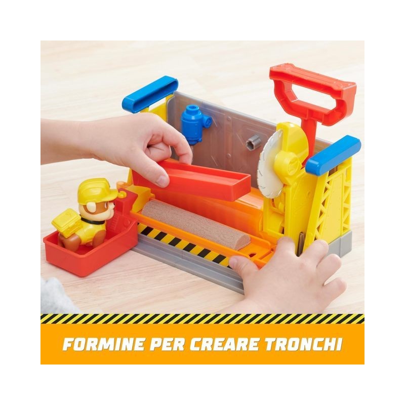 Include 1 Set Officina 1 personaggio Rubble 1 stampo per tronco 2 strumenti per lavorare sabbia Kinetic Sand 85 05 g
