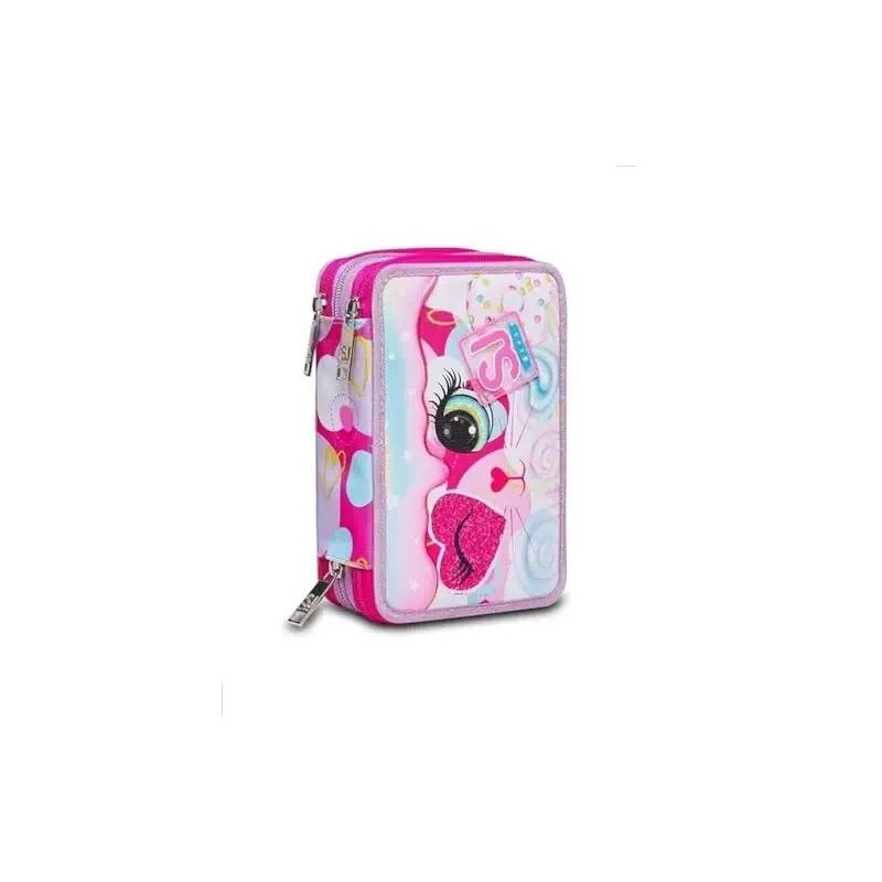 Ciao Sono il coloratissimo Astuccio 3 zip SJ Gang Dotato di 3 scomparti completi di tutto il materiale necessario per fare al meglio i tuoi lavori di scuola puoi abbinarmi a uno zaino o a un trolley SJ Gang