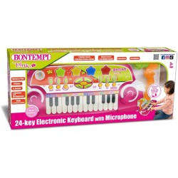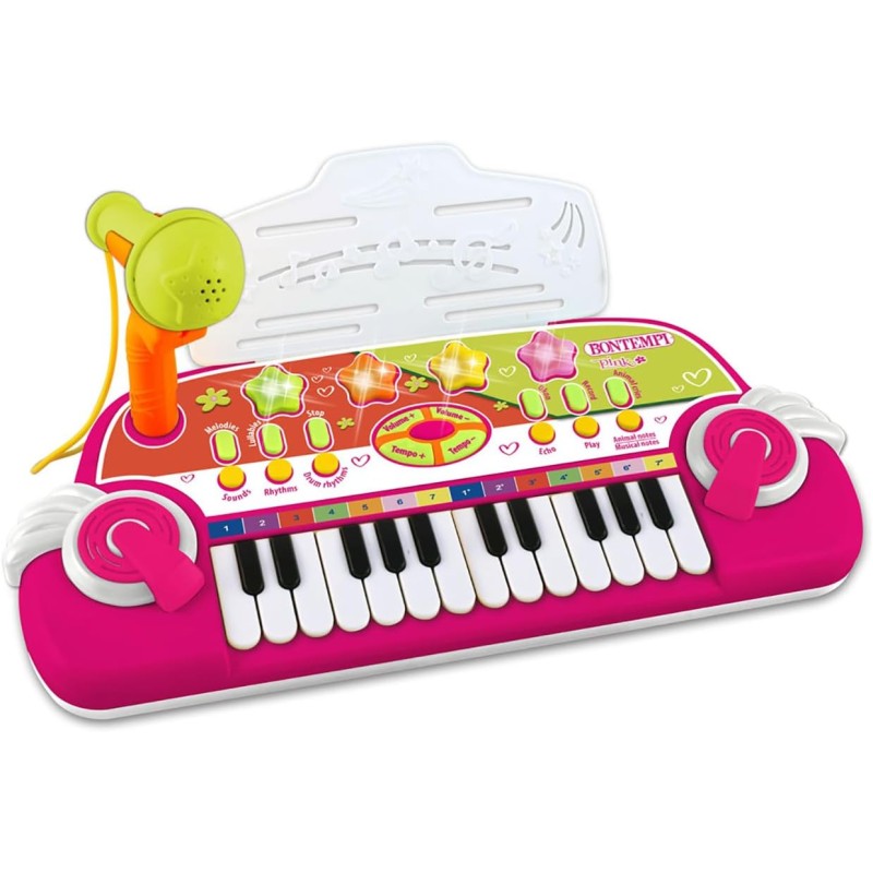 Tastiera Elettronica 24 Tasti con Microfono Scopri il piacere della musica con questa tastiera elettronica completa ideale per chi inizia a esplorare il mondo della musica Funzioni Musicali Complete Dotata di 8 suoni diversi 8 ritmi con accompagnamento di batteria 8 melodie integrate e 30 ninne nanne Include la funzione OKON per facilitare l apprendimento musicale Effetti Sonori e Visivi Regola il volume e il tempo a tuo piacere goditi l effetto eco e divertiti con gli effetti luminosi Offre anche suoni di 4 animali e note musicali con voci animali per un divertimento extra Connessioni e Accessori Può collegarsi a sorgenti musicali esterne come MP3 e smartphone cavo non incluso e include un leggio Non include l adattatore di rete ma ha una funzione di spegnimento automatico per risparmio energetico Dimensioni Compatte Misura solo 370x160x50 mm rendendo questa tastiera facilmente trasportabile e adatta a qualsiasi spazio domestico