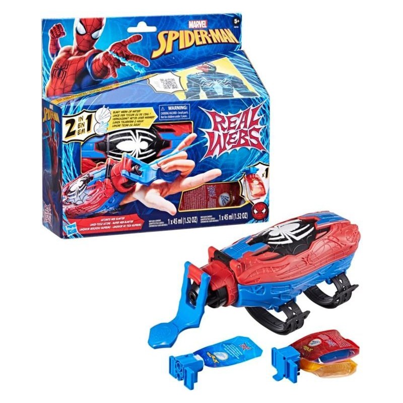 LANCIA RAGNATELE REALISTICHE COME SPIDER MAN spara ragnatele proprio come Spider Man Carica la bottiglietta di ragnatele realistiche inclusa ricariche vendute separatamente Premi il pulsante e fai la mossa di Spider Man per entrare in azione