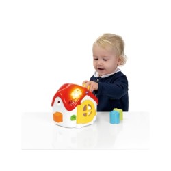 Centro multiattività elettronico bilingue che unisce un classico gioco educativo a una forma iconica e riconoscibile dai bambini la casa Insegna in 2 lingue le prime lettere forme colori e animali Pulsante a forma di uccellino sul tetto che si illumina e attiva musica e suoni Porta interattiva che riconosce se è aperta o chiusa e riproduce canzoni frasi e melodie in italiano e inglese 4 diverse aree di gioco tetto porta e i due lati della casa con due attività aggiuntive di forme e incastri insegna in due lingue le prime lettere forme colori e animali
