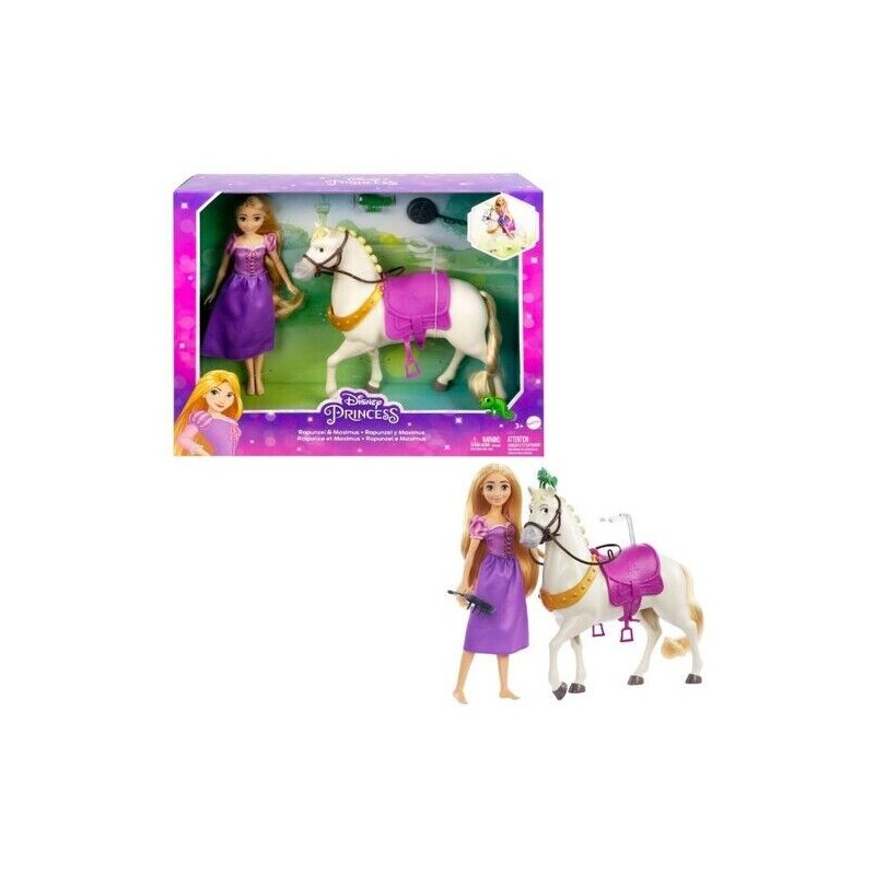 Questa bambola Rapunzel ispirata all allegra e creativa principessa del film Disney Rapunzel è pronta per l avventura con il suo fedele destriero Maximus Con sella e briglie per Maximus oltre a ginocchia snodate per la bambola Rapunzel questo fiero duo è pronti a cavalcare insieme per tutto il regno Pascal può essere agganciato alla criniera di Maximus o al braccio di Rapunzel e partecipare al divertimento La bambola non può reggersi in piedi da sola Colori e decorazioni possono variare